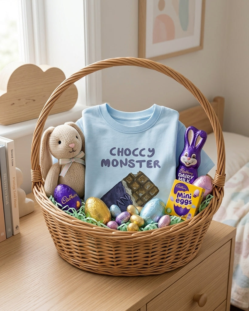 Fun Hand Painted Design: Features a playful watercolour block of chocolate & slogan 'Choccy Monster' on the front.