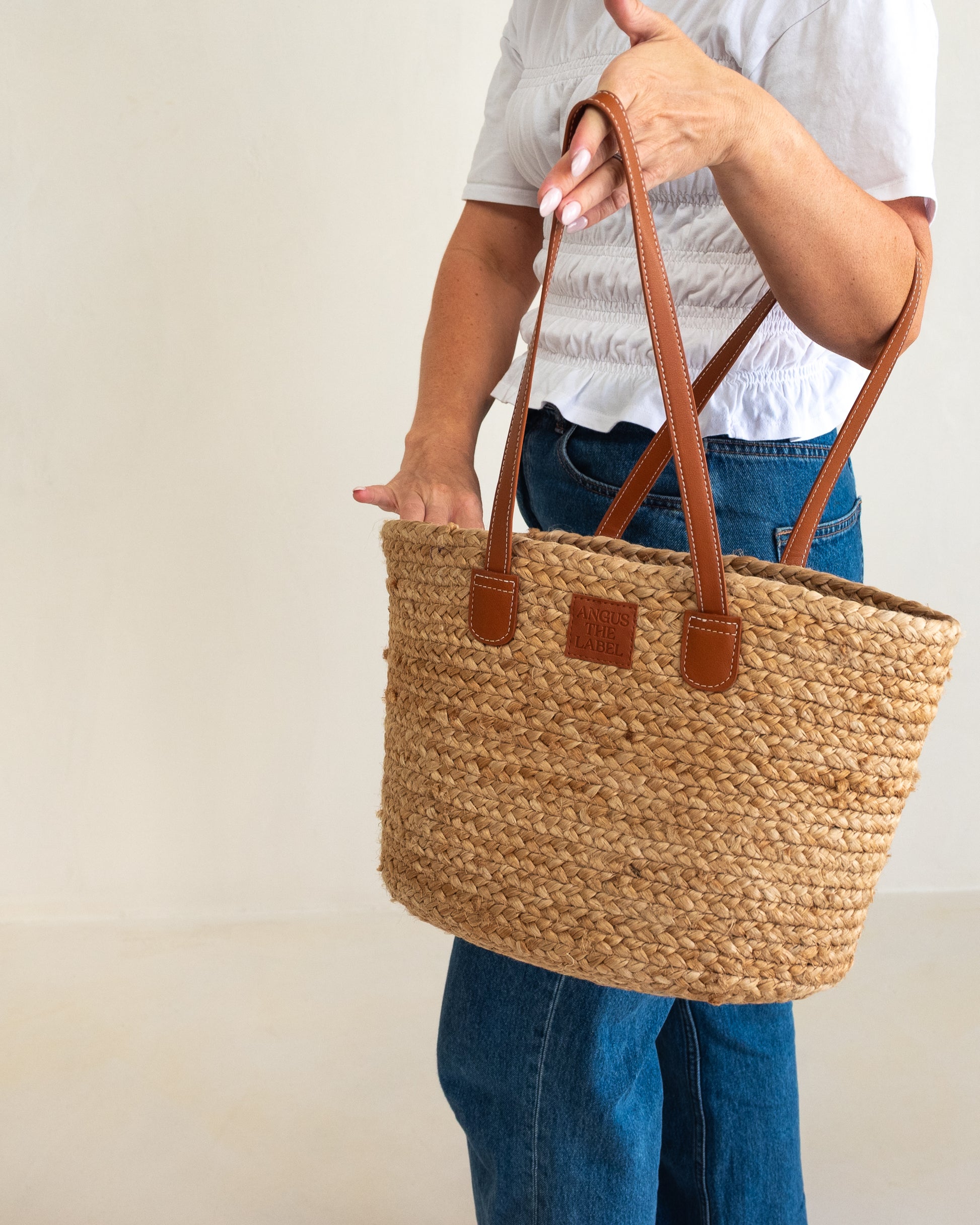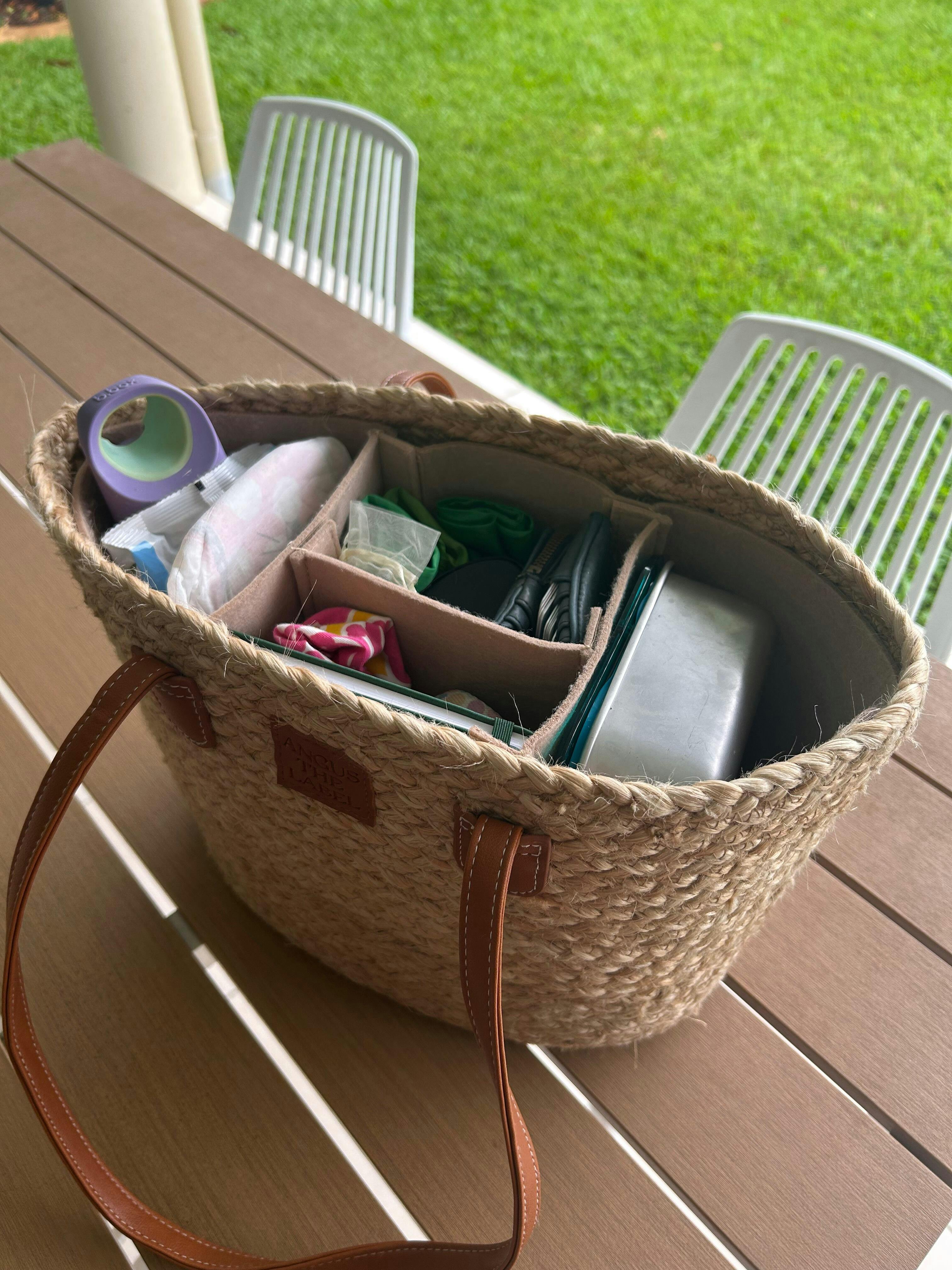 Removable Insert: A custom felt insert with adjustable Velcro dividers keeps life organised in style. Adjust your compartments, or remove it entirely for an effortlessly cool straw bucket look.